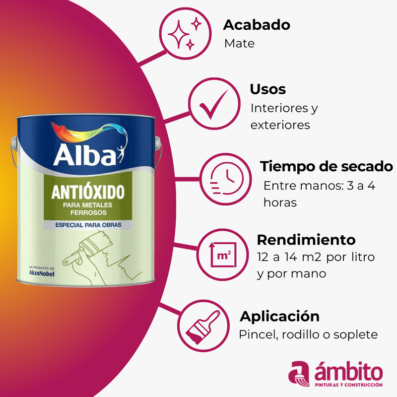 El Fondo Antióxido Standard Alba de 4 L es un fondo sintético mate diseñado para metales ferrosos, tanto para interiores como exteriores, que ayuda a prevenir y detener la oxidación, brindando una base ideal para la pintura de terminación.