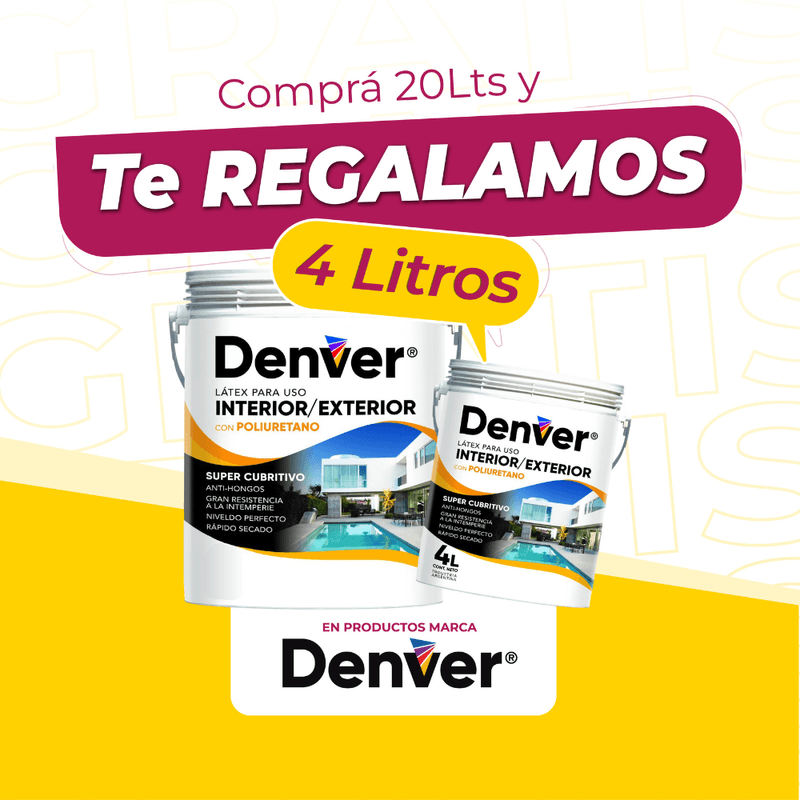 La Pintura Látex con Poliuretano Denver 20L es una solución versátil y de alta calidad para tus proyectos de decoración y protección. Diseñada para uso interior y exterior, combina la resistencia del poliuretano con la suavidad del acabado mate, logrando una excelente terminación en paredes y techos. Su fórmula de base acrílica garantiza un gran poder cubritivo, fácil aplicación y resistencia superior a las inclemencias del tiempo