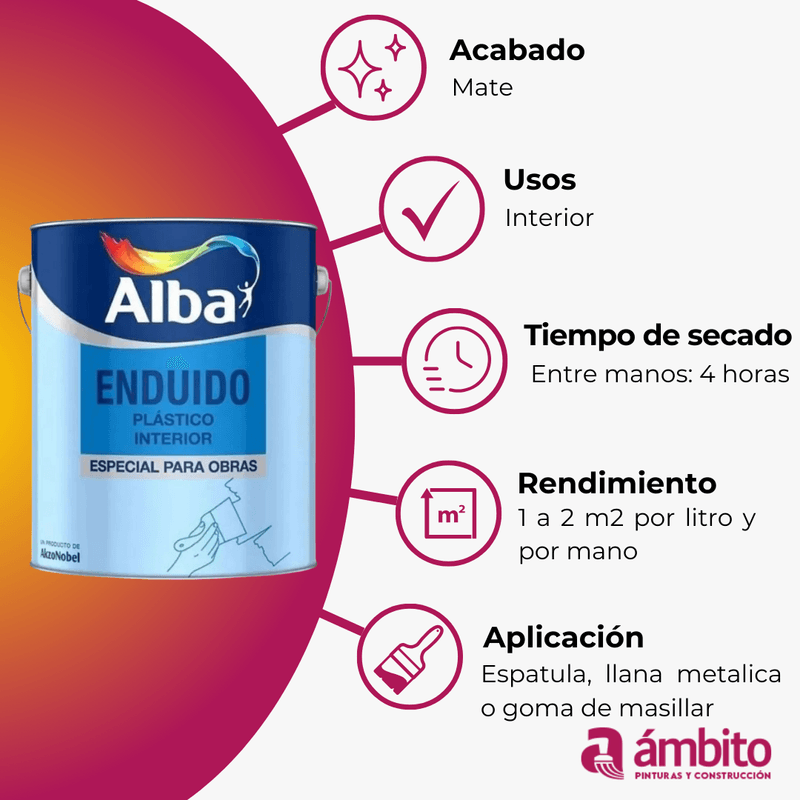 Este enduido acrílico para interiores está especialmente formulado para reparar pequeños daños y fisuras en superficies a ser pintadas. Permite obtener terminaciones perfectamente lisas y de gran calidad. Su aplicación es fácil, tiene un rápido secado y excelente lijabilidad. No deja olor. En todos los casos requiere una pintura de terminación: al látex o sintética. Superficies aptas: Mampostería, yeso, tableros o placas de yeso y madera Acabado: Mate Tiempo de secado entre capas: 4 horas Secado apto para lijar: 8 horas Método de aplicación: Espátula, llana metálica o goma de masillar
