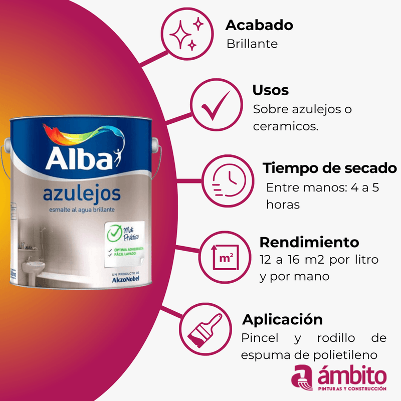 Esmalte al agua de terminación brillante. Posee una optima adherencia, es de fácil aplicación y rápido secado. Formulado en base a polímeros acrílicos especiales en emulsión acuosa y diseñado especialmente para la aplicación sobre azulejos o cerámicos de baños, cocinas y lavaderos. De color blanco, pueden lograrse colores pasteles con entonadores o sistema tintometrico.