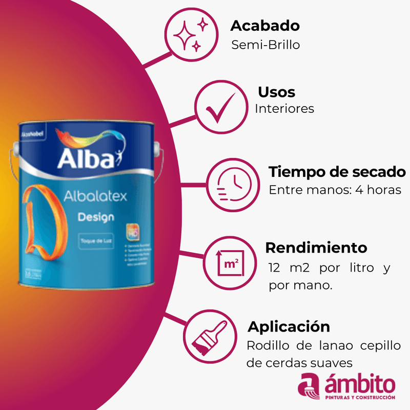 Albalatex Design Toque de Luz fue diseñado para lograr un efecto sedoso, de gran suavidad y altamente decorativo. Su exclusiva tecnología Paredes HD ofrece una terminación eggshell en alta definición. Látex para Interiores con excelente nivelación, alto poder cubritivo y resistencia a la suciedad. De fácil aplicación y rápido secado. No deja olor