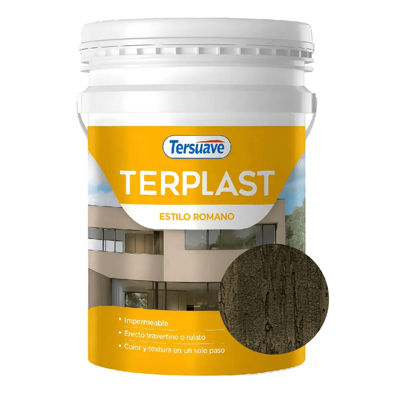 Terplast Estilo Romano es un revoque plástico texturable, 100% impermeable de base acuosa, creado con emulsiones avanzadas y pigmentos de alta calidad que aseguran películas de alto espesor y gran elasticidad permanente, lo que permite obtener una alta durabilidad en exteriores y un film que acompaña los movimientos de dilatación y contracción de las superficies por acción de la temperatura.