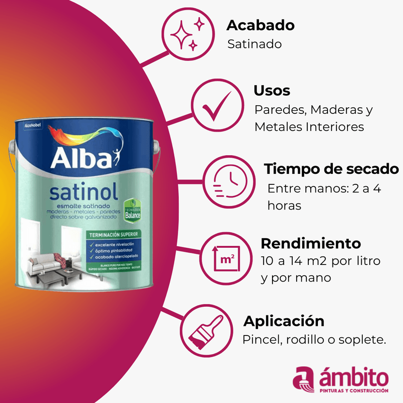 Satinol al agua, es un esmalte al agua que forma una delicada película satinada. El uso de polímeros acrílicos y una nueva tecnología, permitió obtener un producto con excelente terminación, bajo olor, rápido secado y fácil de aplicar. Satinol al agua tiene una gran resistencia a la intemperie, a la abrasión, al uso y a los lavados.